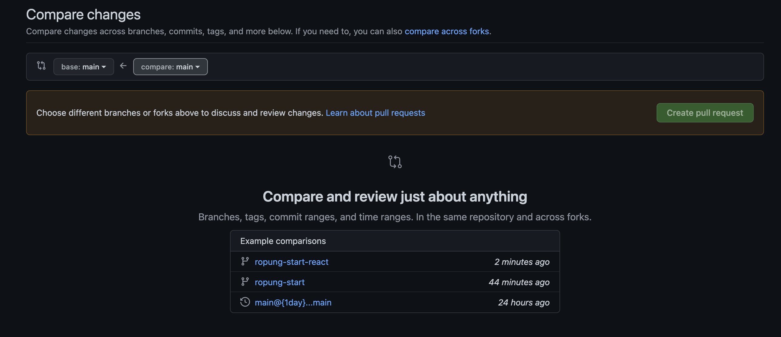 내가 병합하고 싶은 브랜치를 선택하면 변경점 과 커밋메시지 를 볼수있다.