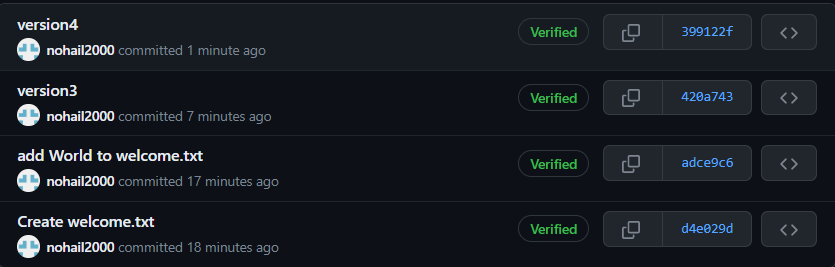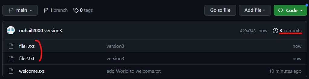 welcome.txt파일을 생성하고 2번 수정하였고, file1과 file2를 업로드 하여 총 3개의 commits가 생성되었다.