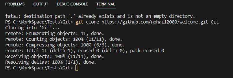 git clone 복제한주소 .를 누르면 현제 디렉토리와 github 저장소와 연결이 된다. VScode 터미널에서 연결해보았는데 안되서 Git 이라고 디렉토리 명을 적어서 연결하니 성공한 모습이다.