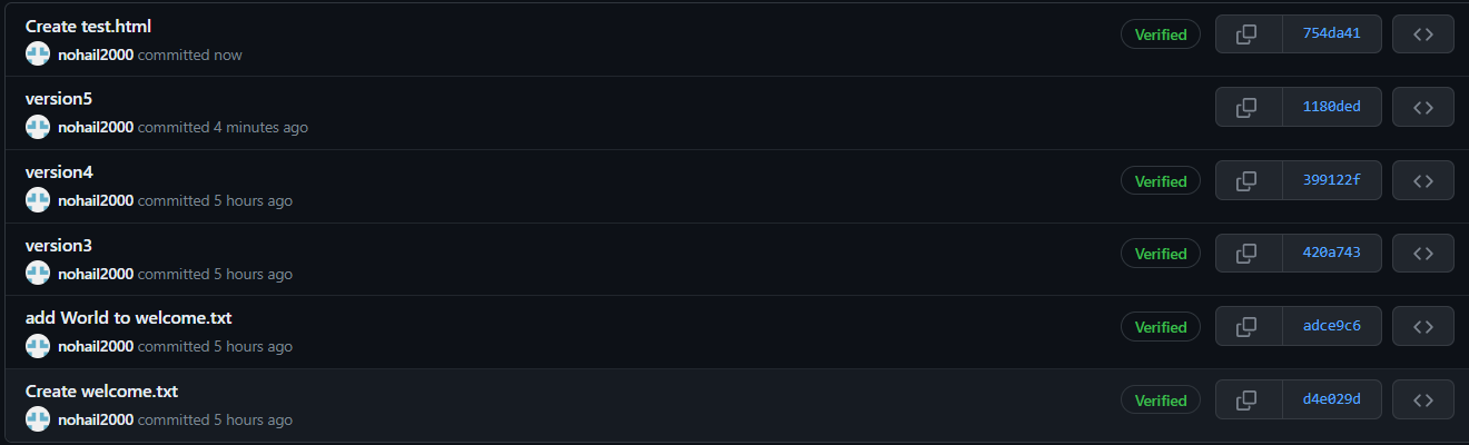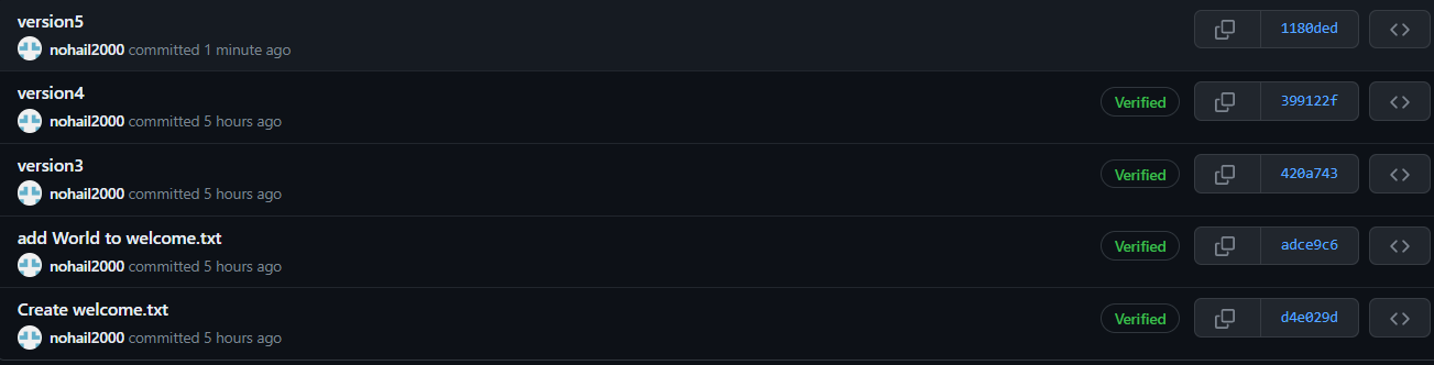 git commit -m "version5" : 현재 수정된 내용을 version5 라는 버젼으로 만들겠다는 커밋의 의미
