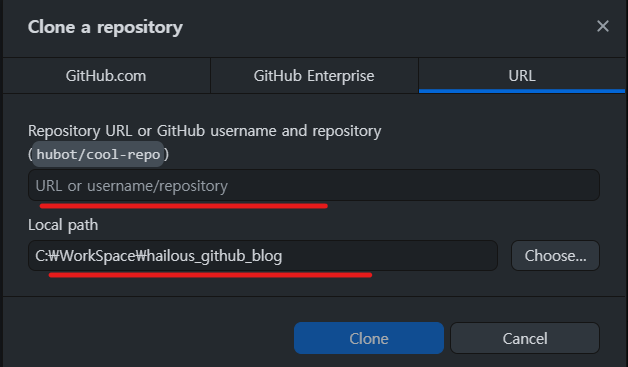 Add > Clone repository 해주고 나온 창의 URL에 주소를 복사해준다. 클론 한 파일을 저장하는 Local path도 선택해준다.