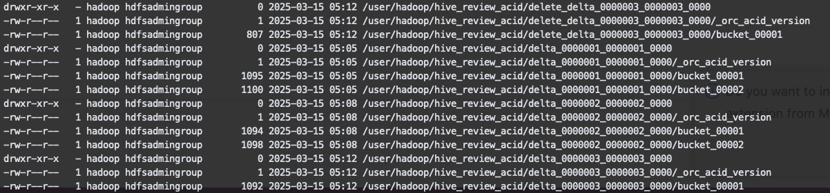 아래와 같이 Delta File은 폴더 형식으로 생성되며 각 폴더 아래는 bucket_XXXXX 형식으로 된 Base File이 존재합니다.