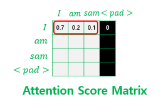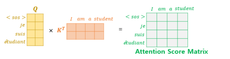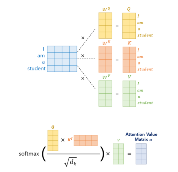 반면, Transformer의 self-attention은 입력 문장 내의 모든 단어들이 서로를 어떻게 주의 하는지를 계산한다. 따라서, 행렬 연산으로 Q, K, V벡터를 한꺼번에 계산하면 I am a student문장에 대한 가중치 정보가 담긴 하나의 Attention Value 행렬이 만들어진다.