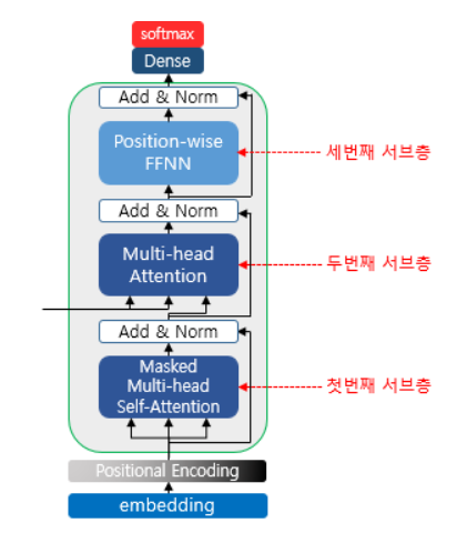 그 외에도 Multi-head Self Attention의 과정에서 입력 토큰이 고정된 길이를 가지도록 하기 위해 패딩 토큰을 사용하게 되는 데, 이 패딩 토큰은 의미가 없는 단어이기 때문에 어텐션 계산 과정에서 배제되어야 한다. 이 패딩값에는 −∞를 곱하여 Softmax 계산 시에 0에 수렴되게 하는 방법을 사용한다.