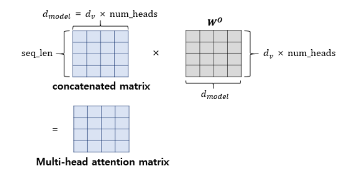 마지막으로 각각의 Attention Head 정보를 다시 하나의 통합된 표현으로 만들기 위해 가중치를 곱해서 최종적으로 attention 행렬이 된다.