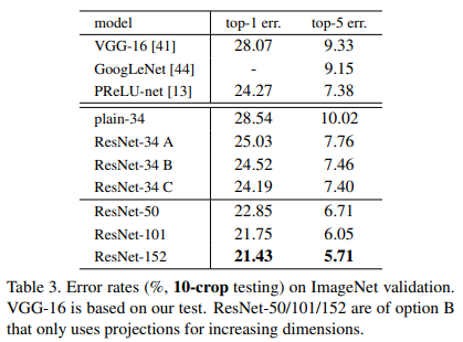 ResNet-34 A는 차원수가 늘어날 때 선형변환 방법으로 제로패딩 적용, B는 1x1 Convolution을 적용한 projection connection 적용, C는 모든 Skip connection에서 projection connection을 적용