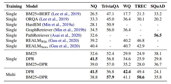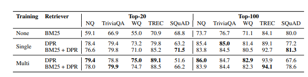 -TREC, WebQuestions, TriviaQA 데이터셋은 질문, 답변 쌍만 제공되기 때문에 BM25의 상위 문서를 긍정 문서로 사용하고, 답변이 포함된 문서가 없는 경우 폐기