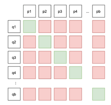 in-batch negative: n개의 질문과 긍정 문서의 임베딩 값 Q, P에 대해서 를 수행하면 유사도 행렬이 생기는 데, (Qi,Pj) 쌍이 i = j로 같으면 긍정 예제로 구분하고 그렇지 않으면 부정 예제로 구분해서 효율적인 학습