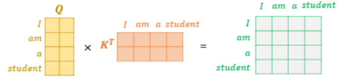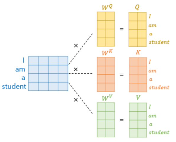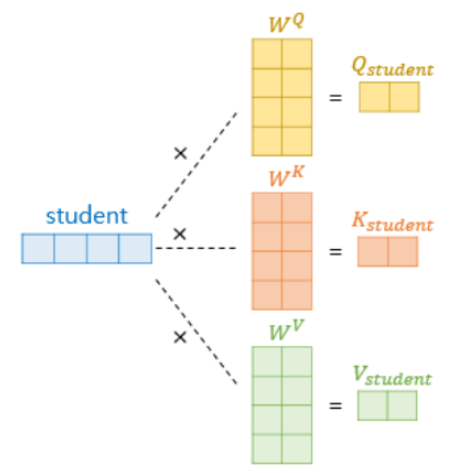 I, am, a, student라는 문장 정보가 담긴 (4, 512)행렬과 각 문장 단어의 q, k, v의 가중치 행렬 (512, 64)와의 곱으로 문장 각 단어의 q, k, v 정보가 담긴 (4, 64)행렬을 얻을 수 있다.
