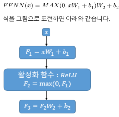 그 다음 구해진 멀티 헤드 어텐션 값을 다시 인공신경망 dense층으로 넣어주는데, 이유는 어텐션이 결국 입력 토큰의 가중 합계이며 이 출력에 직접 적용되는 비선형 변환은 없다. FFNN을 통해 이를 실행하면 비선형성이 도입되어 모델이 더 복잡한 패턴과 표현을 학습할 수 있다. 또한, 각 단어의 특징을 추출할 수 있다.