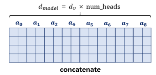 8개의 어텐션을 구해서 모두 cancatenate하면 어텐션 헤드 행렬의 크기는 (seq_len, d model)이 된다. 그리고 이 결과물과 같은 크기의 가중치 행렬을 곱해서 multi-head attention의 최종 결과물이 나온다.