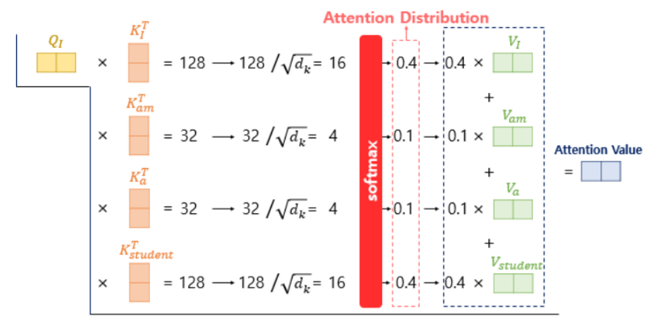 이렇게 각 단어의 q값과 모든 입력 단어를 비교해서 자기 단어와 입력 단어와의 관련성을 나타내는 어텐션 스코어를 구한 다음 소프트 맥스 함수로 표현된 Attention distribution 스칼라 값과 value 벡터와 곱한다. 그럼 value 벡터에 관련성에 따른 가중치가 반영되는 것이다.