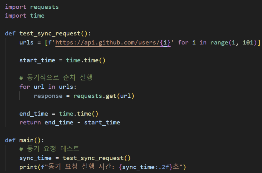 위 코드는 GET API 요청 100개를 순차적으로 동기 처리하는 코드이다.