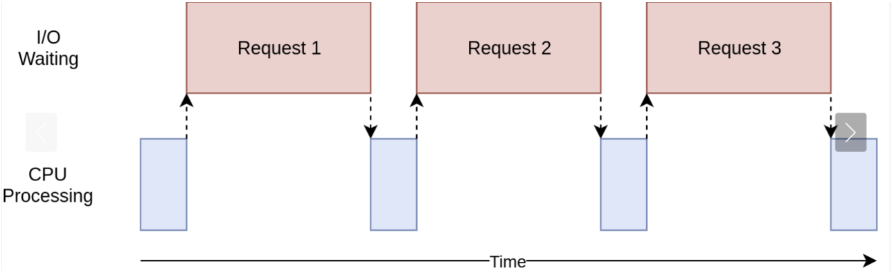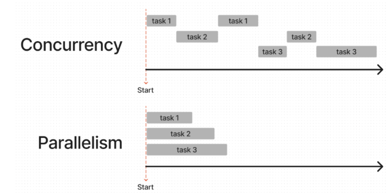 하지만, 비동기 처리는 이전 단계가 끝나지 않더라도 다음 단계를 실행할 수 있는데, 크게 동시성(concurrency) 또는 병렬성(parallelism)을 가지고 여러 작업을 동시에 수행할 수 있다.