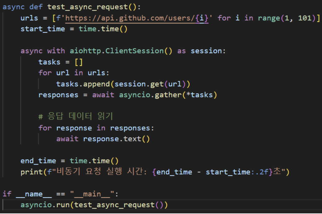 코루틴을 사용하기 위해선 asyncio.run()로 이벤트 루프를 만든 다음 test_async_request() 코루틴 객체가 등록