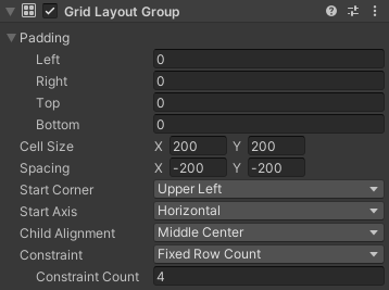 GridLayoutGroup의 컴포넌트는 위와 같이 구성되어 있다.