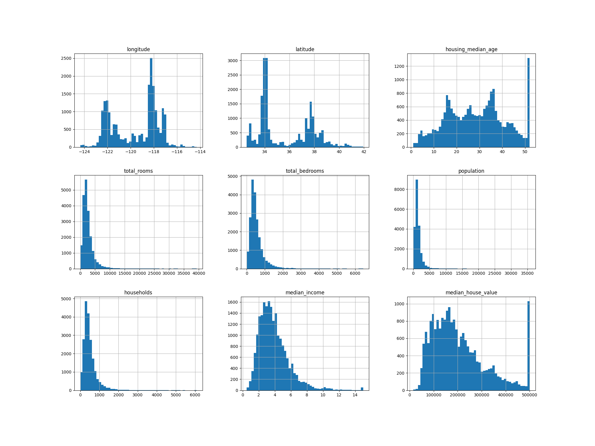 longitude | latitude | housing_median_age | total_rooms | total_bedrooms | population | households | median_income | median_house_value | |