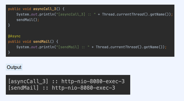 이 케이스도 내부 메서드를 호출하였기에 스프링 빈 컨테이너의 도움이나 프록시로 감싸는 과정이 없어서 하나의 쓰레드로 동작하게 된다.