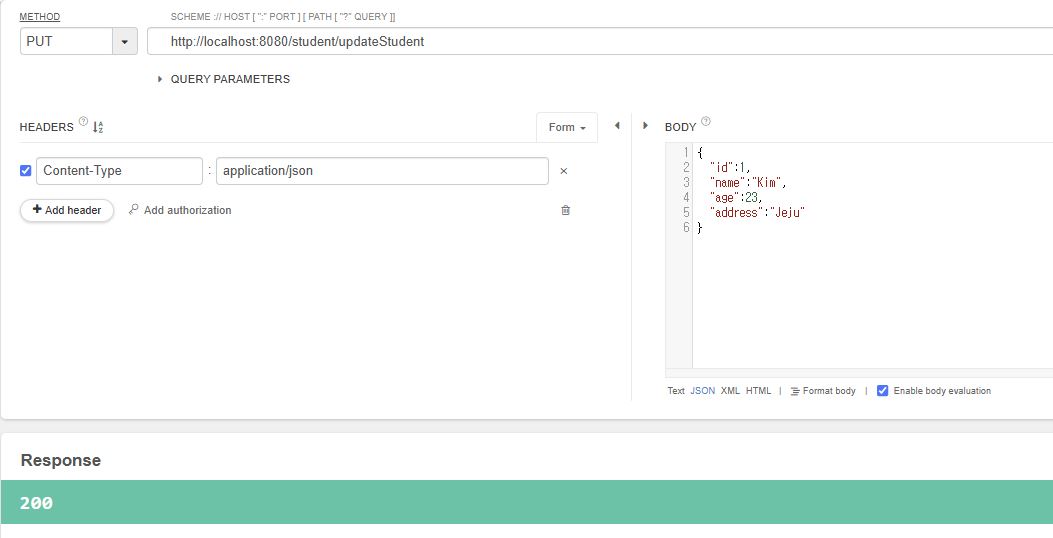 학생이 인천에서 제주도로 이사를 가서 주소 정보를 변경할건데 PUT API를 호출해서 정보를 수정해보자.