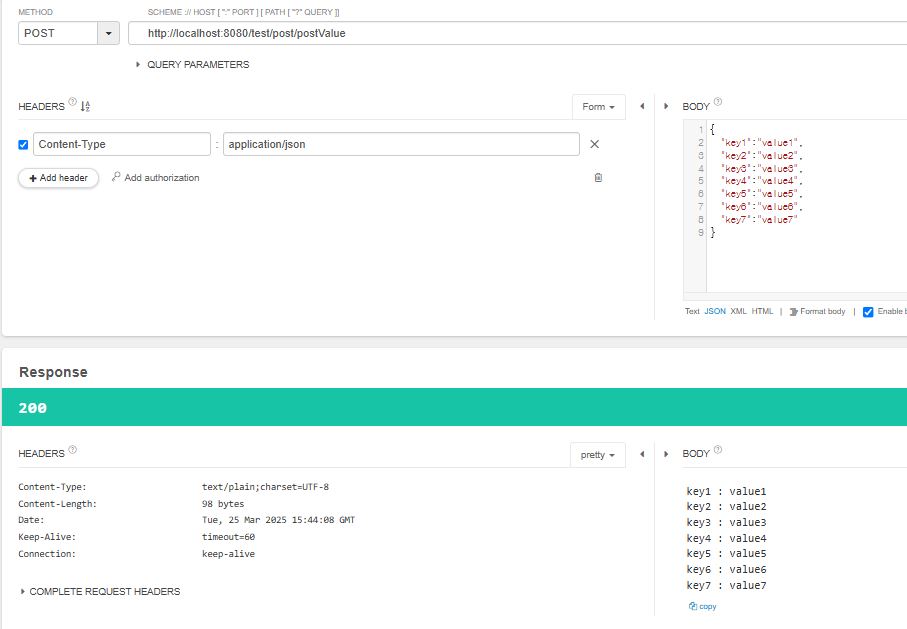 다시 정리하자면, GET API에서는 Map이든 DTO든 URI에 리소스를 입력하여 요청을 하였지만, POST API에서는 JSON 형식으로 데이터를 입력하고 이는 HTTP Body를 통해 서버에 전달되는 방식이다.