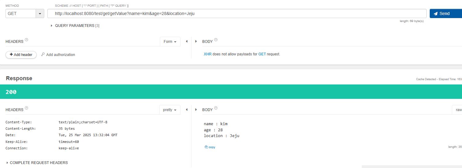 매개변수를 @RequestParam으로 지정하면 URI에서 ? 기준 우측에 key=value 형태로 구성된 요청을 보내는 것이다.