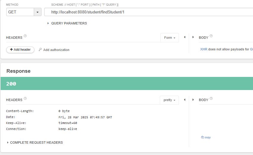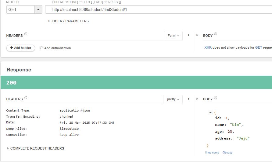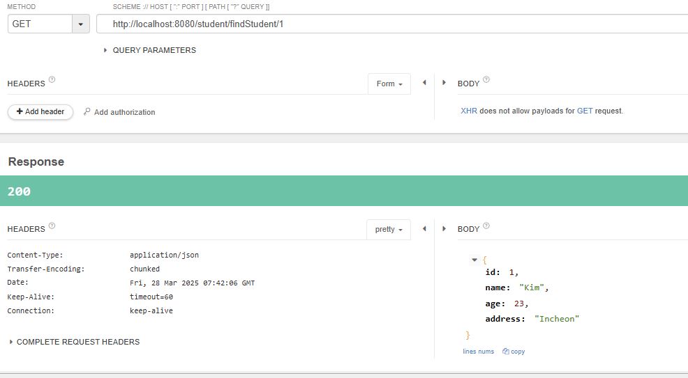 이제 제대로 저장되었는지 GET API를 통해 확인해보자. id로 학생을 구분하기 때문에 리소스를 식별할 수 있는 값으로 id를 입력하고 @PathVairable로 URL에 입력한 값이 매개변수로 들어온다.