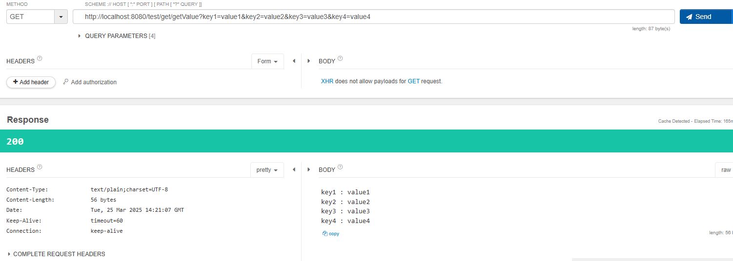 DTO 클래스에 선언된 필드는 쿼리 파라미터의 key와 매핑되기 때문에 URI에는 순서와 상관없이 key=value에 해당하는 값으로 입력이 된다.