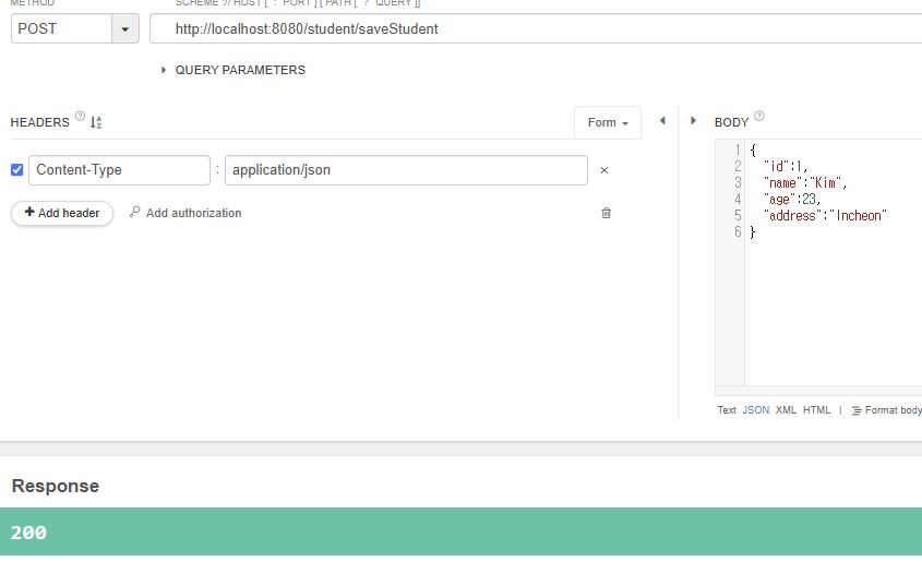 학생 DTO 필드값에 맞게 JSON 형식으로 정보를 입력하면 된다.