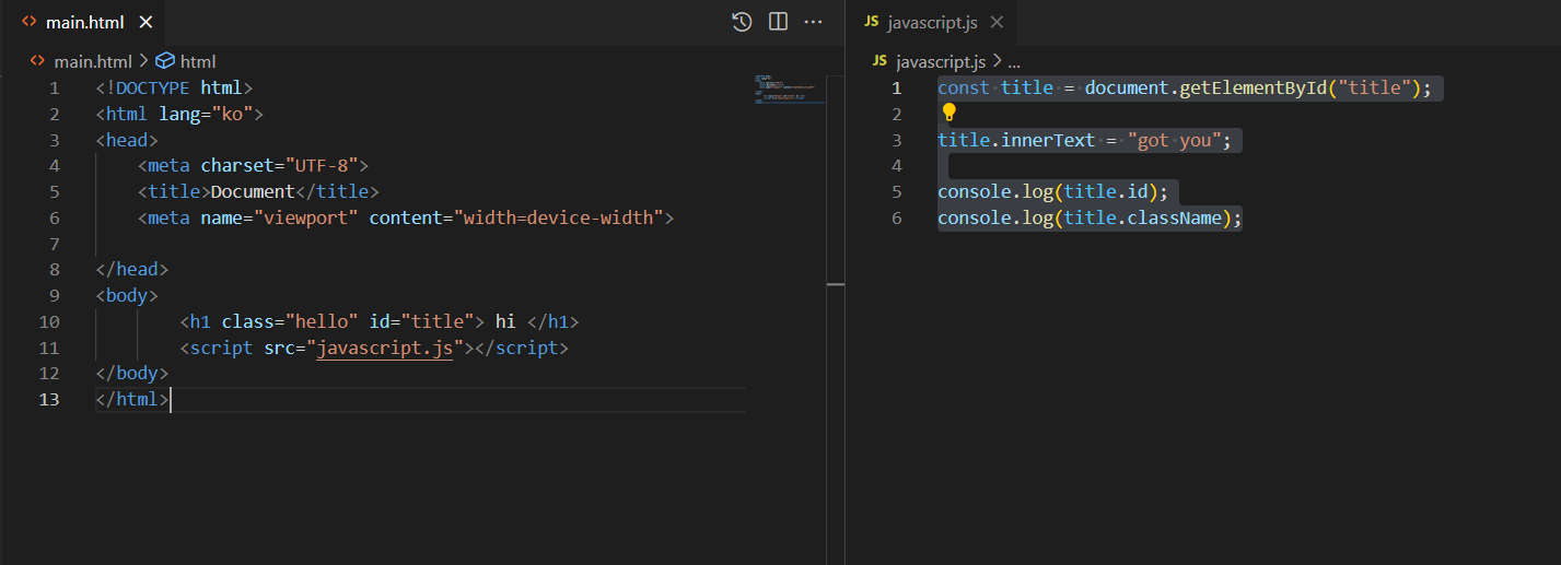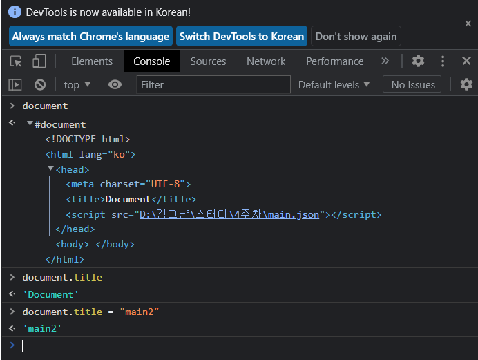 - console.dir(title) 을 자바스크립트에 입력 후 실행, 브라우저의 console에서 property와 event를 확인할 수 있다.