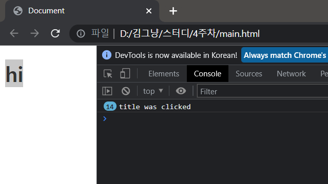 => hi 를 클릭하면 'title was clicked'가 출력되는 코드이다. (두 코드는 결과가 같음)