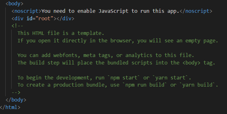index.html의 body에<div id="root"></div>가 있는데, 이 div root로 react 코드가 실행돼서 만들어진 dom이 구현된다.