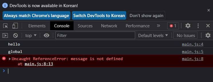 반대로, block을 쓰지 않고 파일 안에다 바로 쓰는 것을 global scope라고 한다. global은 어디서나 접근이 가능하다.