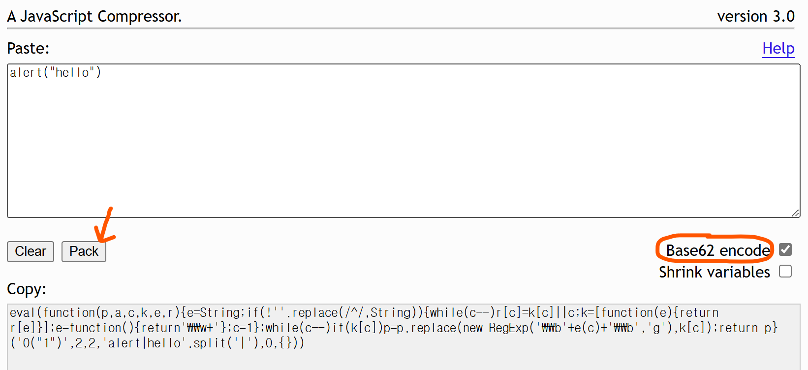 Base64 encode에 체크 표시를 하고 Pack 버튼을 눌러주면 입력한 코드가 난독화 된다.