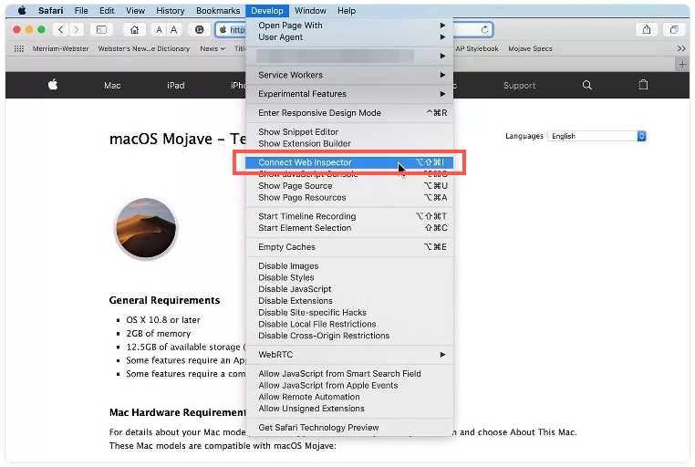 Mac + iPhone 환경이라면 Mac의 Safari 개발자 메뉴에서 아이폰으로 접속한 웹페이지의 개발자 도구를 통해 디버깅을 할 수 있습니다. USB로 연결한 후 Safari > 개발 메뉴에서 기기를 선택하면 됩니다.