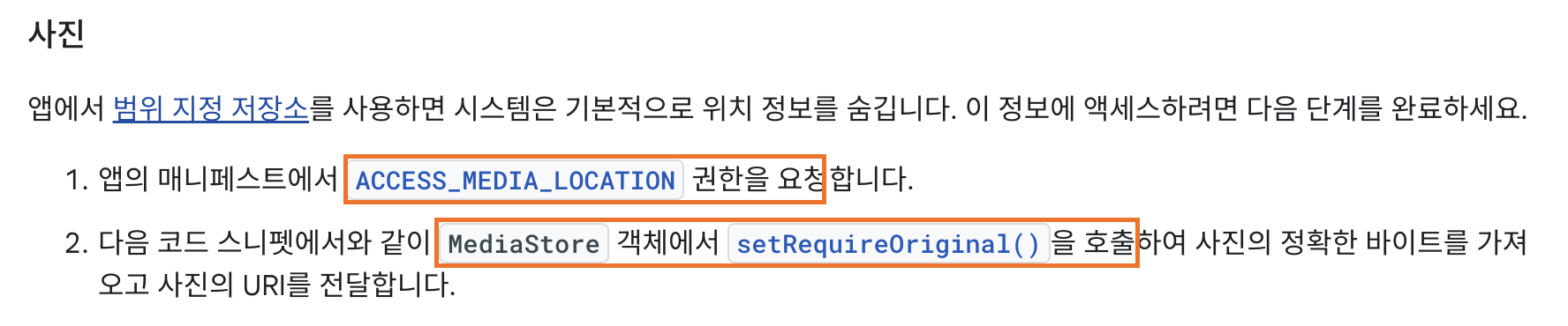 Android 10 이상에서 EXIF 위치 정보에 접근하기 위해서는 앱이
