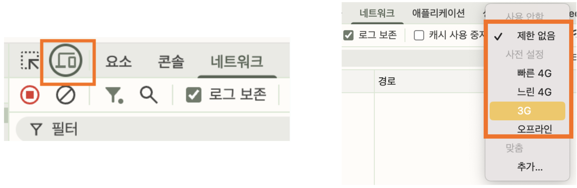 모바일 LTE 환경에서는 다양한 상황에서 연결을 종료할 수 있습니다. 예를 들면 Network 탭에서 Fast 3G에서 Slow 3G로 바꾸면 다음 요청에서 다시 연결을 시도하는 것을 볼 수 있습니다.