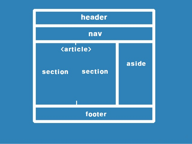 <header> : 헤더 영역 표현<nav> : 네이게이션 바 영역 표현<main> : 전체 컨텐츠 영역 표현<article> : 독립적인 컨텐츠 영역 표현<section> : 컨텐츠 영역 표현, article 태그 안에 여러 개의 section 태그 작성함<aside> : 본문 오른쪽이나 왼쪽 영역 표현<footer> : 웹문서 아래 영역 표현