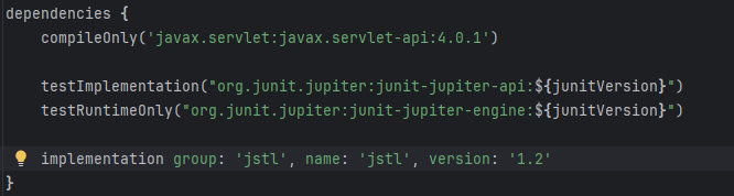 JSTL ์ฌ์ฉํ๊ธฐ ์ํด์๋ ๋ผ์ด๋ธ๋ฌ๋ฆฌ ์ถ๊ฐํ๊ธฐ ์ํด build.grade์ ๋ค์๊ณผ ๊ฐ์ด ์ถ๊ฐํจ.