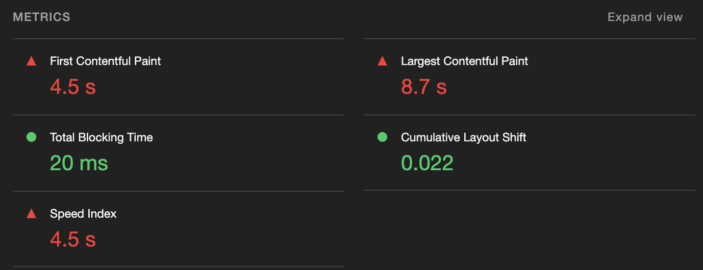 LCP : 8.7초 -> 가장큰 콘테츠가 그려지는 시간