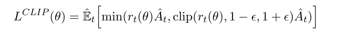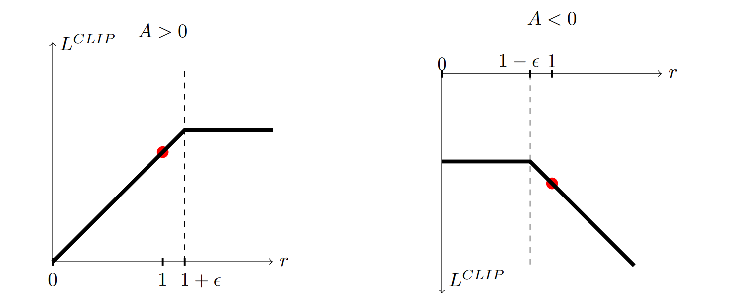 Lclip을 사용하게 되면 위 최대화 수식에서 L이 과도하게 커지는데에 penalty를 부여하는 역할을 하게 된다.