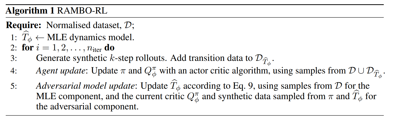 그냥 MOPO알고리즘에서 모델 loss함수에 policy에 적대적이도록 하는 항 추가한게 전부잖아!