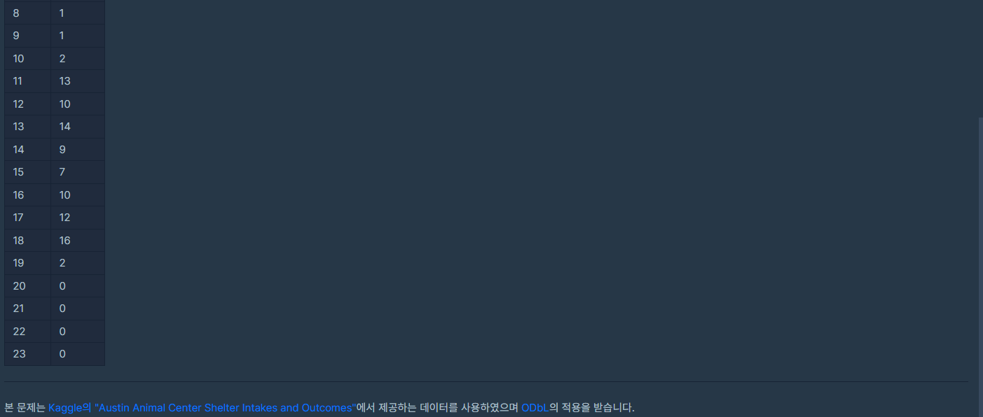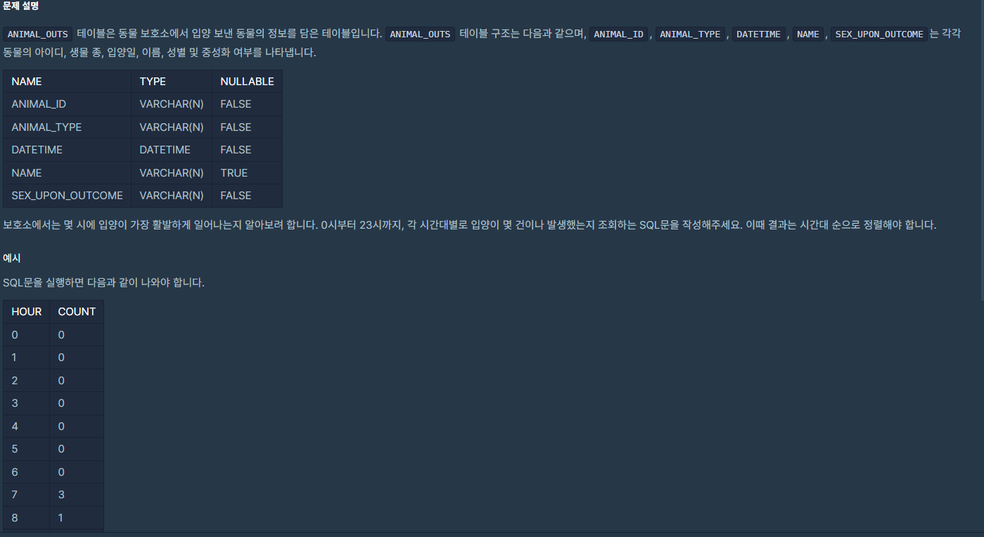 SELECT HOUR, COUNT(ANIMAL_ID) AS COUNT