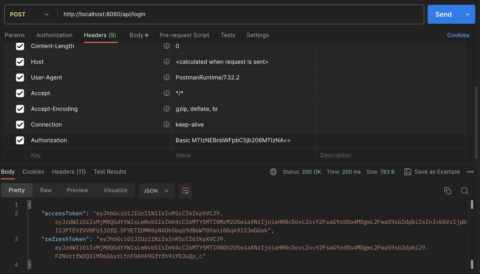 1234@gmail.com:1234를 인코딩하면 MTIzNEBnbWFpbC5jb206MTIzNA== 라는 값이 나온다. 이를 Authorization 헤더에 넣어서 확인해보면,