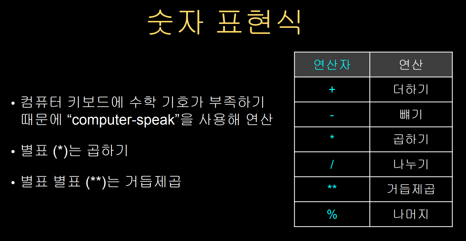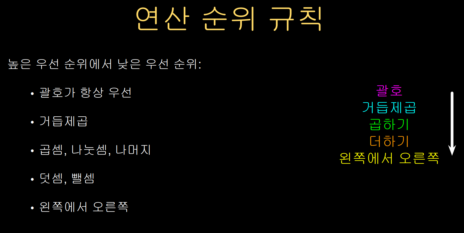 괄호 > 거듭제곱 > 곱셈, 나눗셈 > 덧셈, 뺄셈 > 나머지는 왼쪽에서 오른쪽으로 계산