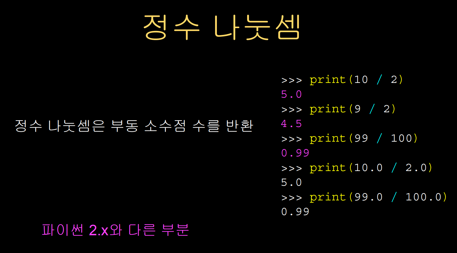 예를 들어 9/2를 하면 알아서 부동소수점형을 부여하여 4.5를 결과로 가져온다.