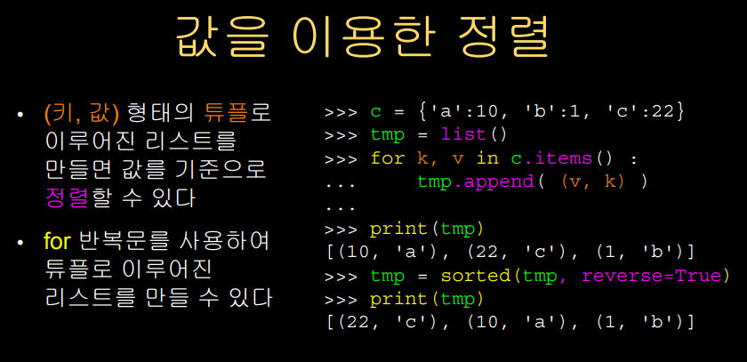 만약, 값이 처음에 키가 뒤에 원소로 나오는 튜플을 가지는 리스트를 만들 수 있다면 값이 큰 것을 정렬하여 우리가 원하는 대로 값을 기준으로 정렬을 할 수도 있을 것이다.