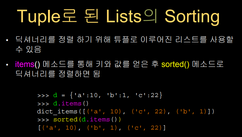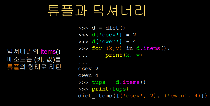 튜플은 이전 챕터에서 배웠던 딕셔너리와도 관계가 있는데,