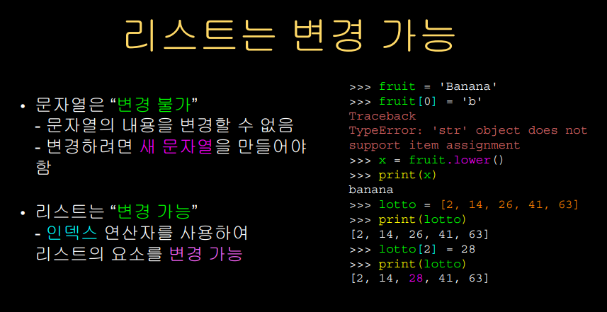 리스트와 문자열의 가장 큰 차이점이라고 한다면 바로 "가변성" 이다.