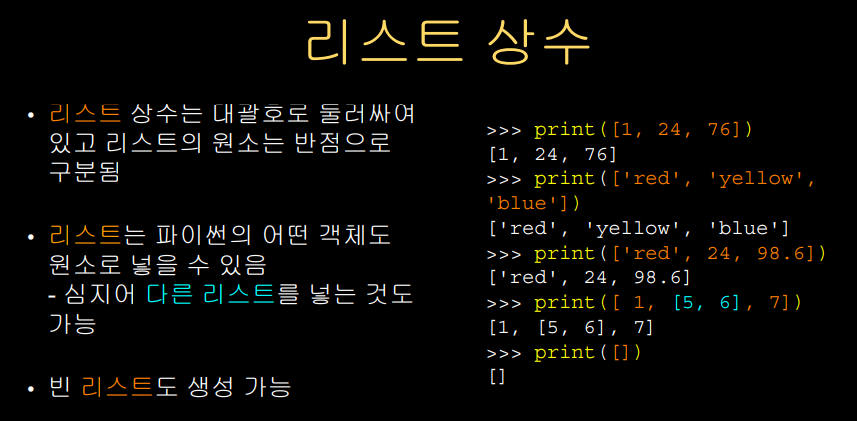 리스트는 기본적으로 리스트 상수이고 어떤 변수에 할당된다.