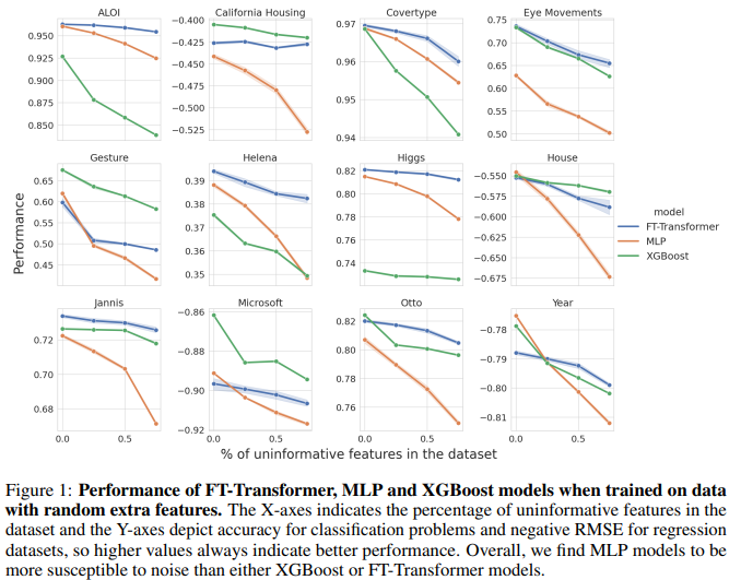 MLP, FT-Transformer, XGBoost 모델을 학습시키고, 특성 중 노이즈 비율을 조절하면서 성능을 비교함.